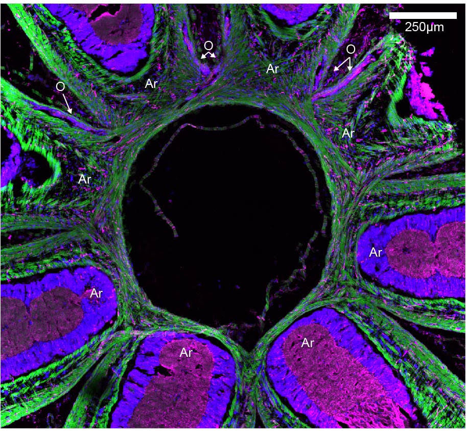 A horizontal slice at the base of the arms (labeled as A) showing the oral INCs (labeled as O) converging and crossing. Credit: Kuuspalu et al., Current Biology, 2022